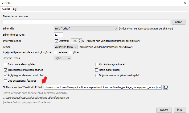 Kodlamaya başlamadan önce Deneyap Kart’ı Arduino IDE’ye tarif edildiği şekilde eklemeniz gerekmektedir. Arduino IDE’de Dosya (File) –> Tercihler (Preferences) adımını takip ederek açılan pencerede Ayarlar (Settings) sekmesinde bulunan Ek Devre Kartları Yöneticisi URL’leri (Additional Boards Manager URLs) kısmına, aşağıda paylaşılan JSON dosyasına ait adresi kopyalayınız.
