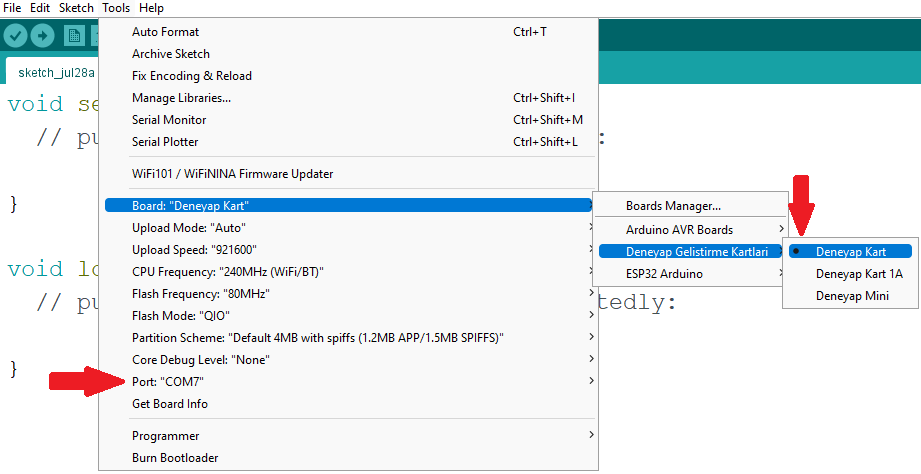 Kodlamaya başlamak için öncelikle en son sürüm Arduino IDE’nin işletim sisteminize uygun olan versiyonunu yüklemeniz gerekmektedir. İndirme işlemi tamamlandıktan sonra kurulumu yapabilirsiniz. Desteğe ihtiyacınız olursa aşağıdaki listeden işletim sisteminizi seçip adım adım kurulumun nasıl yapılacağını öğrenebilirsiniz.Deneyap Kart’ın Arduino IDE’ye Eklenmesi